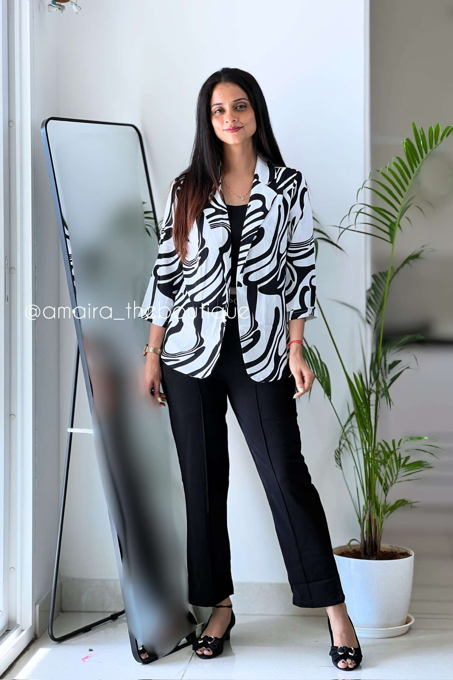 The stretchable polyester pants offer comfort and a flattering fit, balancing structure with ease of movement.